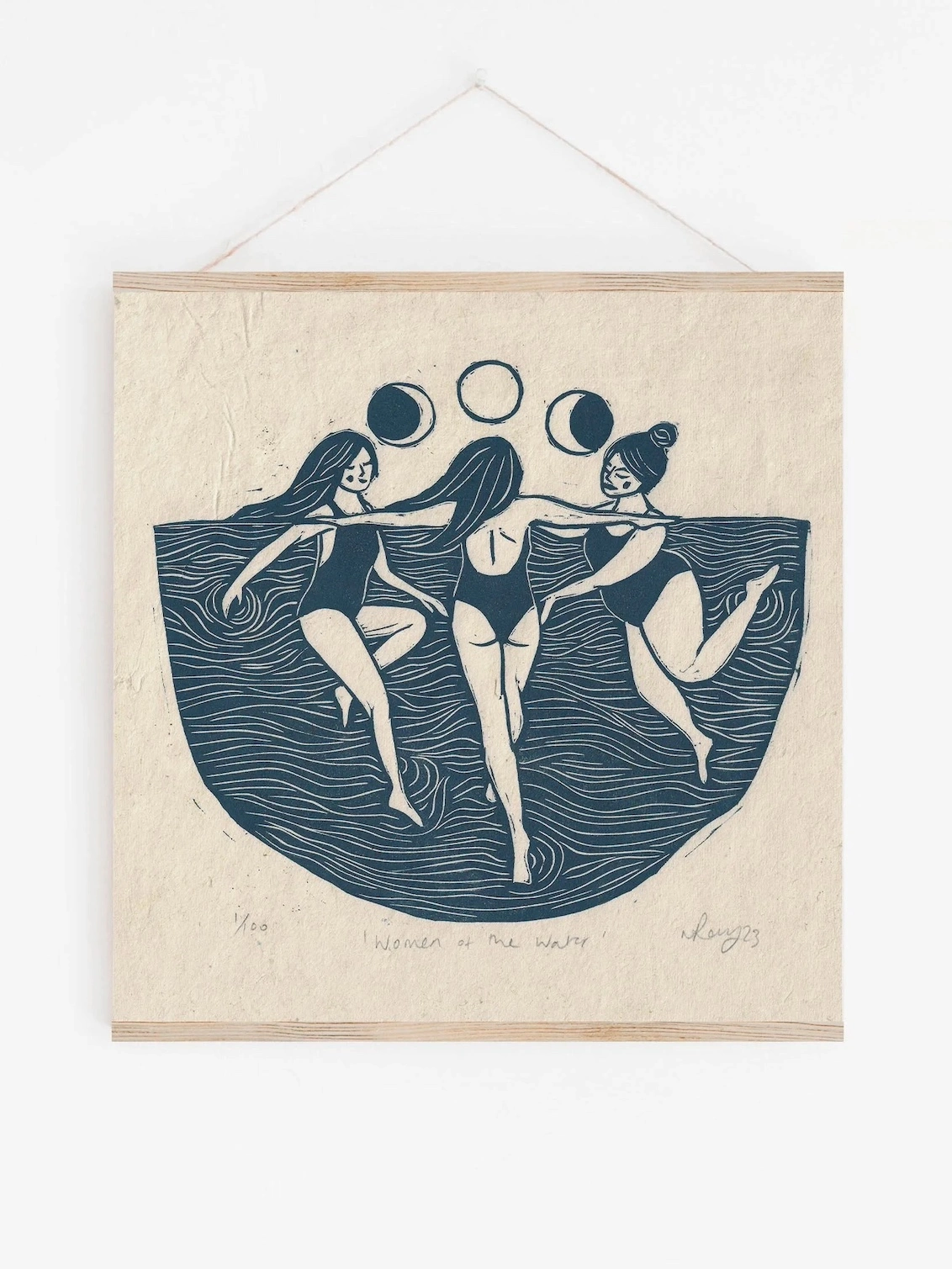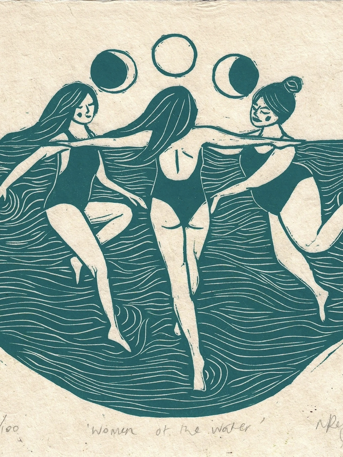 Handmade linocut print. 3 women float to the light of the moon cycles in a calm sea. This is a playful print, exploring the feminine connection to the moon and tides.