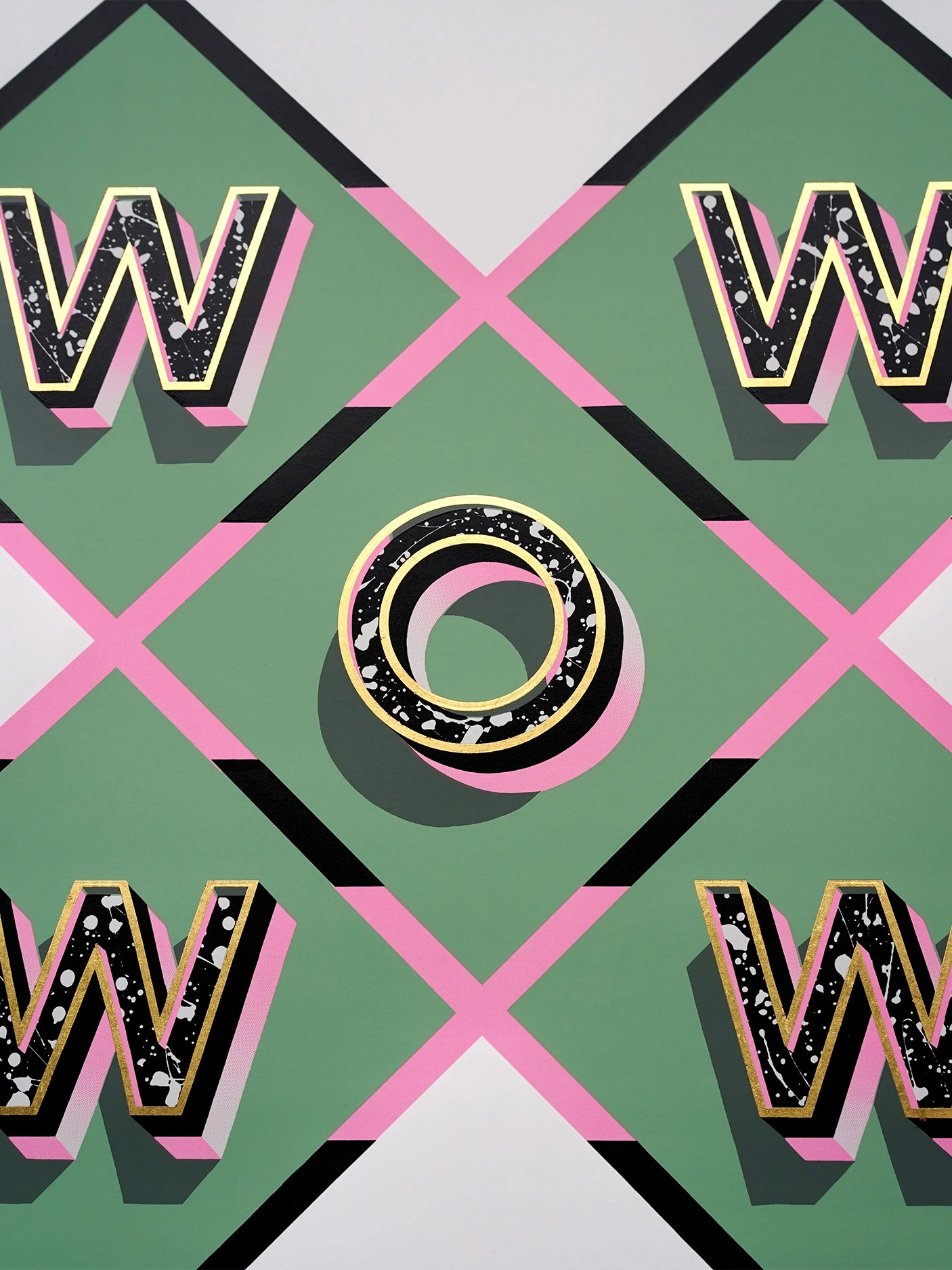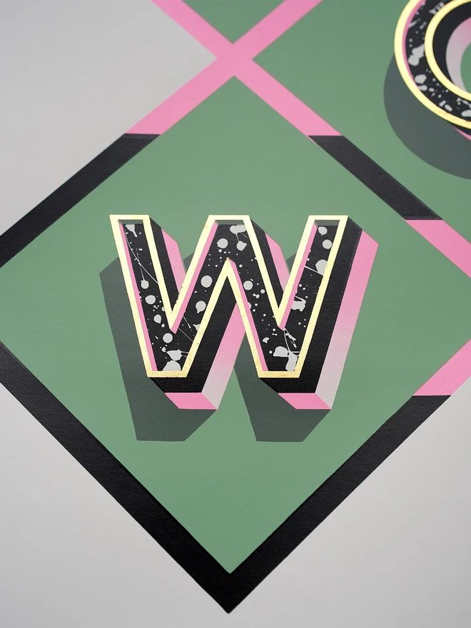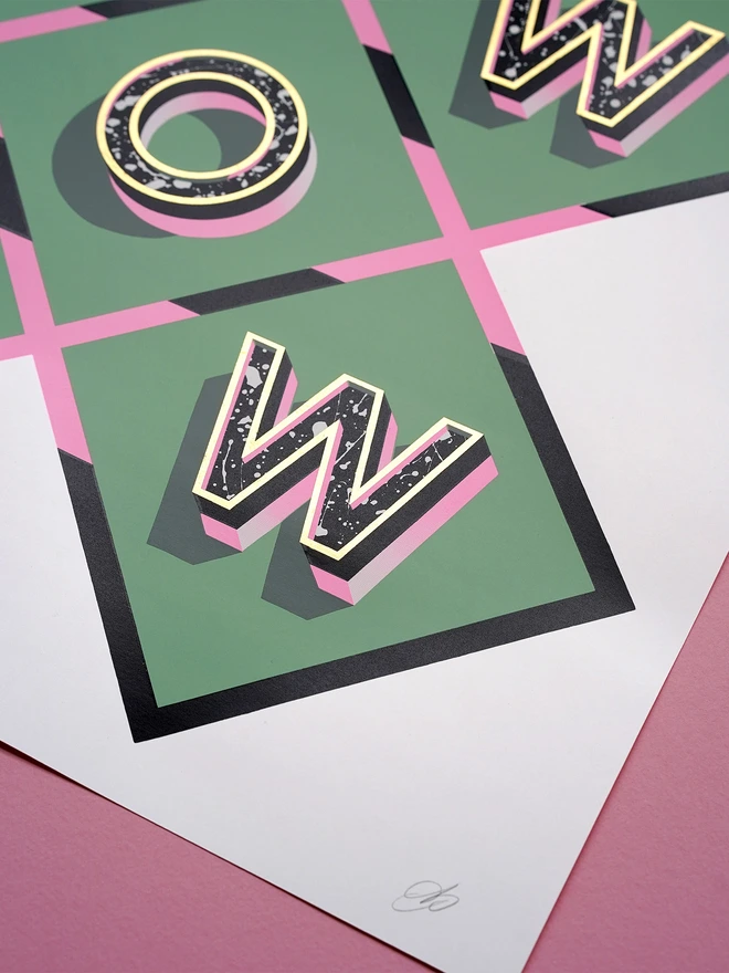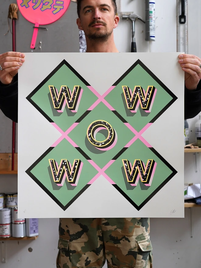 My classic design WOW is back with a brand new soft sage green and pink colourway. This design was first made as a glass, steel and gold piece back in 2018. It was then used for my first ever limited edition screen print release in August 2020. That edition was snapped up in under 24 hours and it paved the way for stream of other editions that followed ever since.