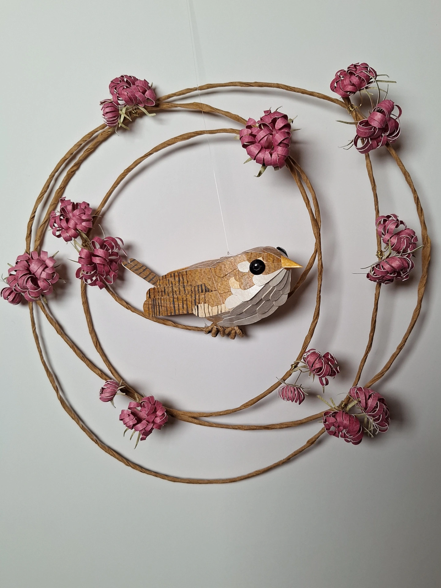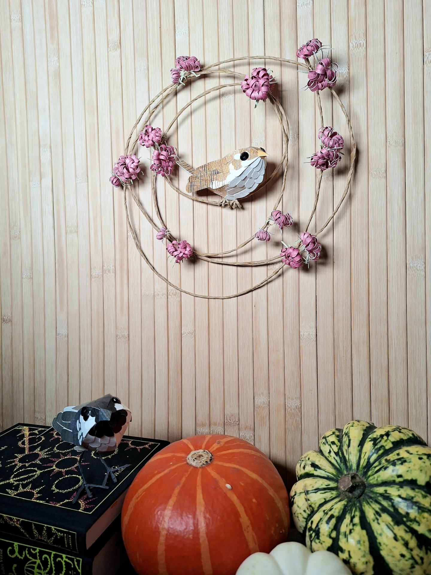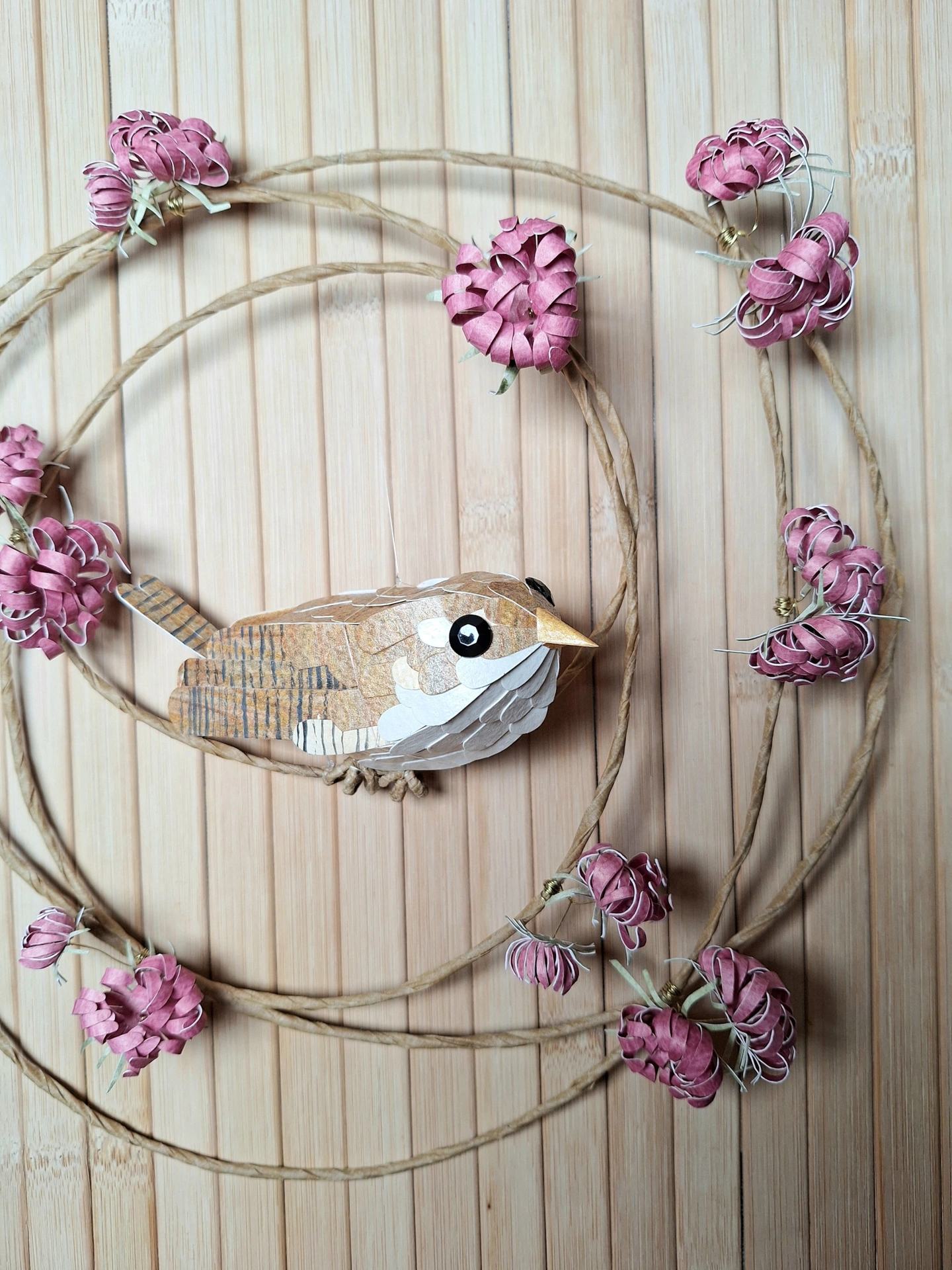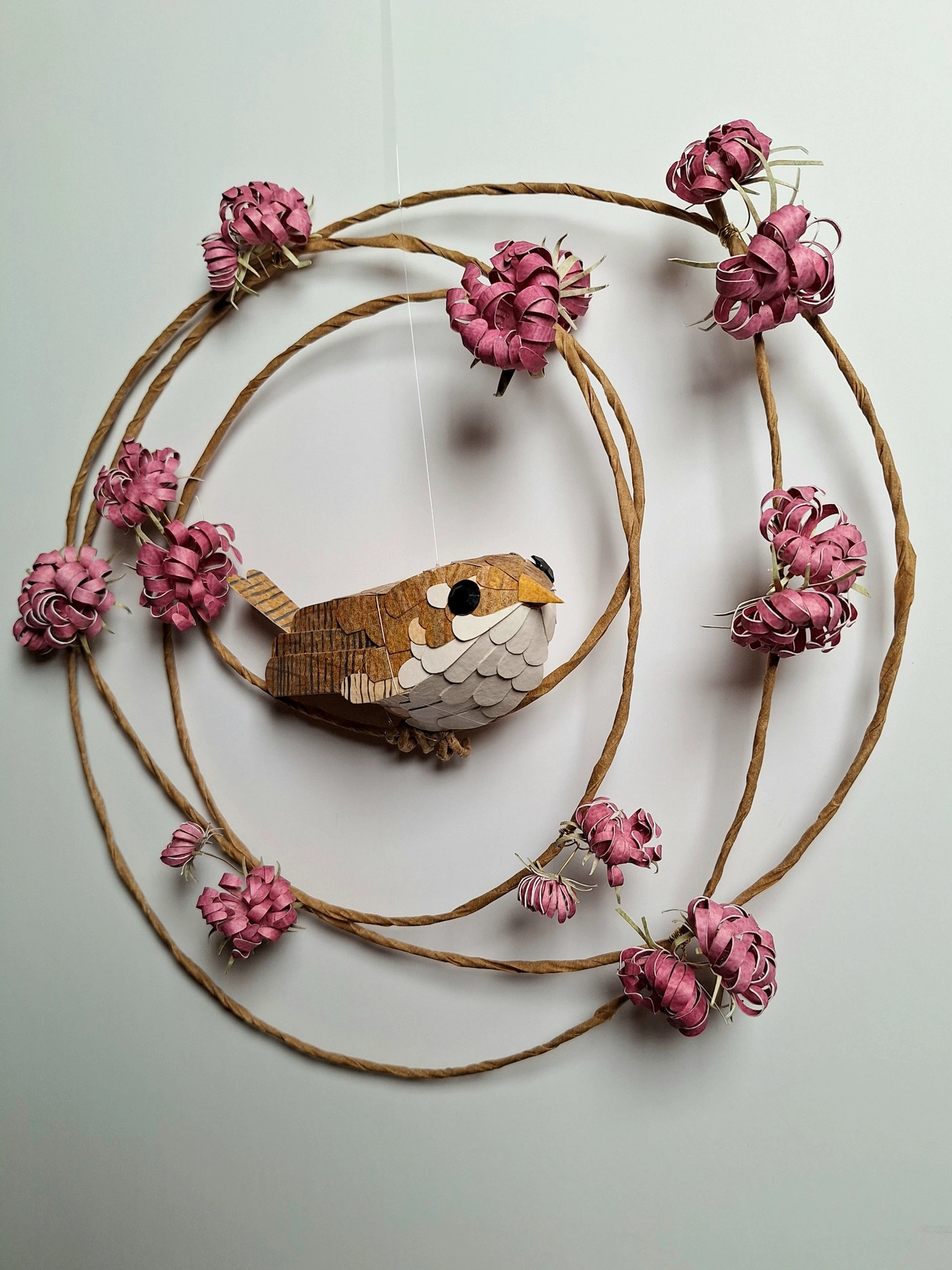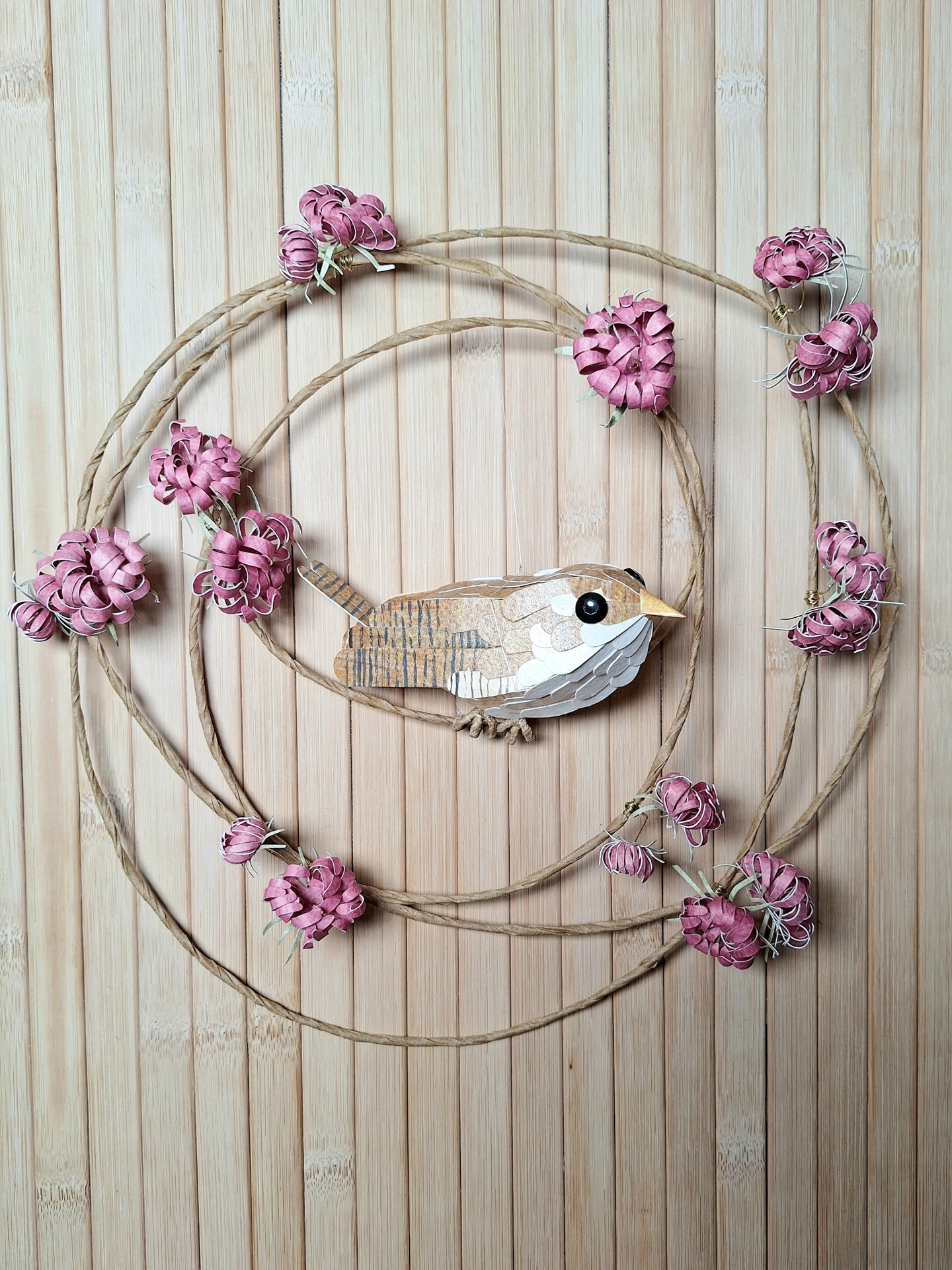 This handmade natured themed wall art features a wren sculpture is made from hand printed papers in brown, cream and white. He sits on a wreath adorned with burgundy red blooms. This handmade sculpture hangs on the wall via a steel hook to bring cheer to...
