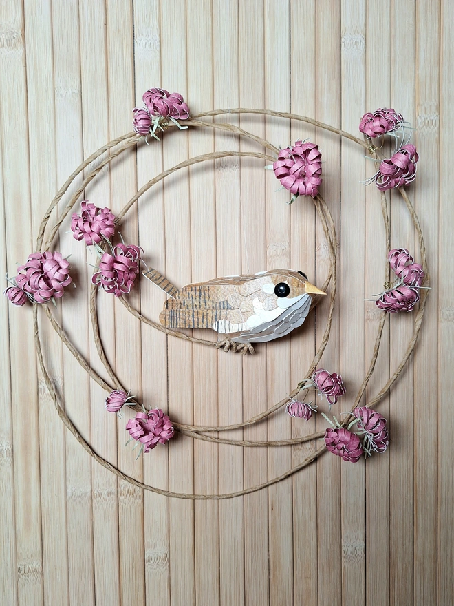 This handmade natured themed wall art features a wren sculpture is made from hand printed papers in brown, cream and white. He sits on a wreath adorned with burgundy red blooms. This handmade sculpture hangs on the wall via a steel hook to bring cheer to your décor.