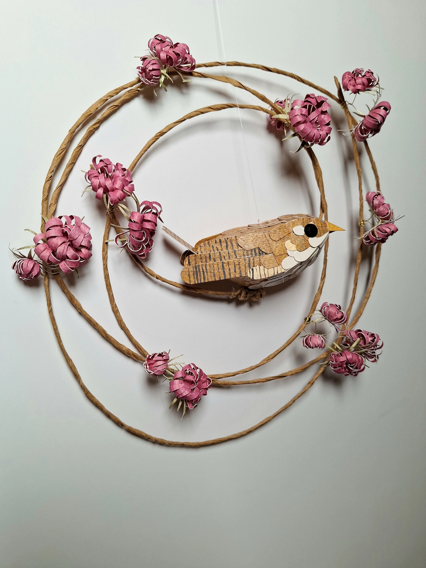 The wren is made from a hand built paper frame,, layering 300 GSM cardstock, which makes him very sturdy. He is covered with hand cut paper feathers. I use traditional printmaking techniques, such as monotype and screen printing, to ensure his colours, markings and are unique to him. The way I build my sculptures by hand also gives him his own unique posture. No bird ever comes out the same! He is varnished with a UV protective lacquer, which seals his edges and ensures his vibrant colours will not fade, so he's as happy hanging in your window as he is on your wall. Each piece of paper is meticulously cut out by hand. The paper is a very sturdy 300 GSM card, which makes my sculptures very robust. I design my sculptures to bring joy to your décor and share my love of wildlife and the great outdoors.