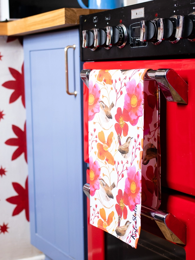 Add a gentle touch of the British countryside to the kitchen with this charming illustrated tea towel, featuring a repeating pattern of wrens and poppies by Kate Slater. Inspired by garden birds and wildflowers, this contemporary design comes in a warm, uplifting palette.