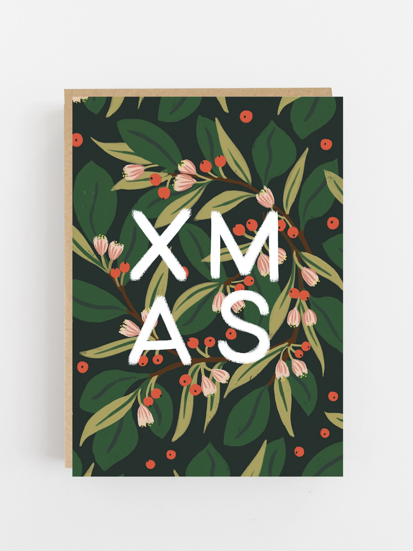 Xmas Card surrounded by a lush green foliage, with pink flowers and red berries.