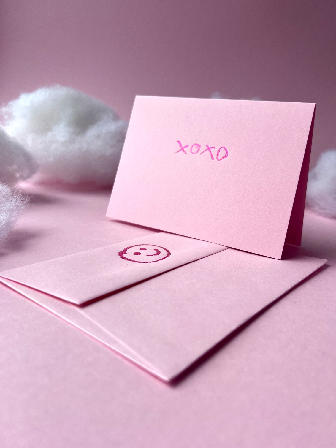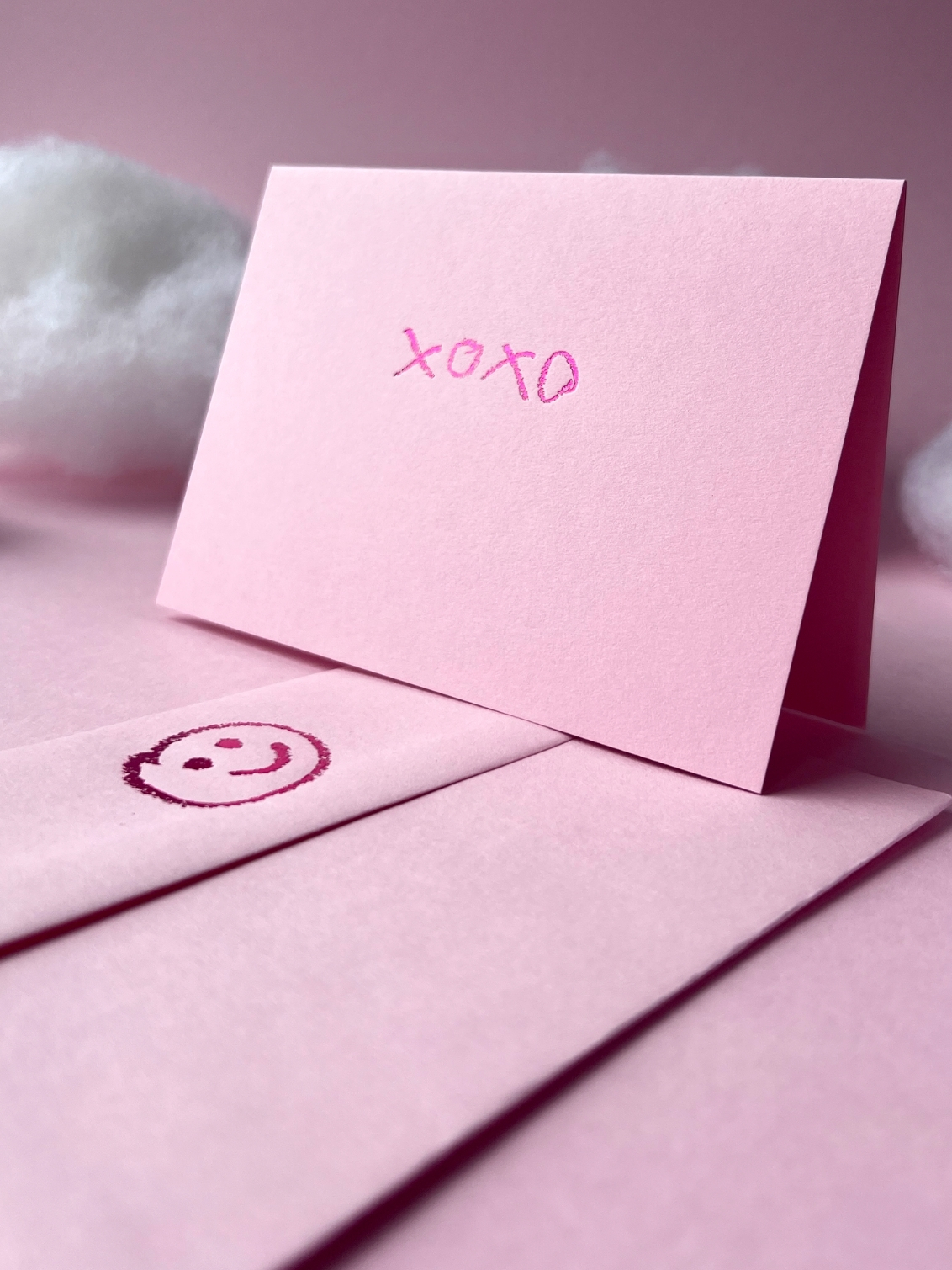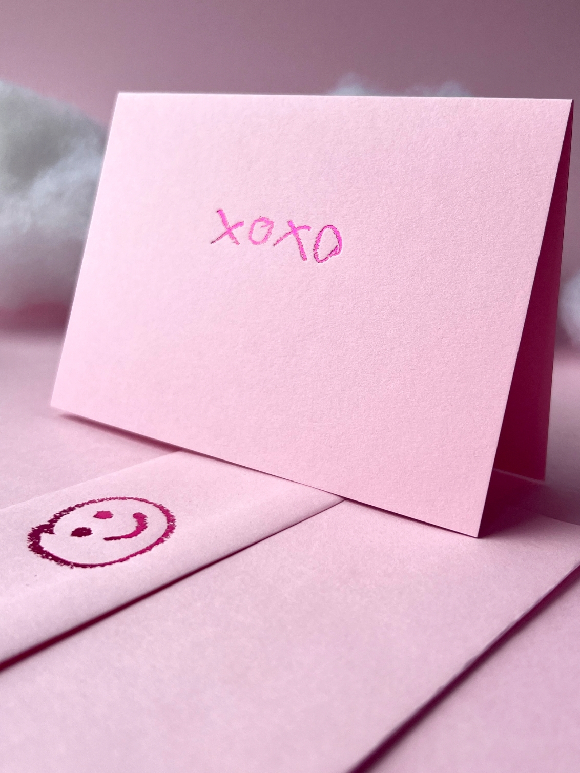 Hugs and kisses, text-style. xoxo is perfect for a little love note, friendship boost, or just sending lovely thoughts. Foiled on candy pink with shiny metallic detail and a smiley face printed on the envelope.