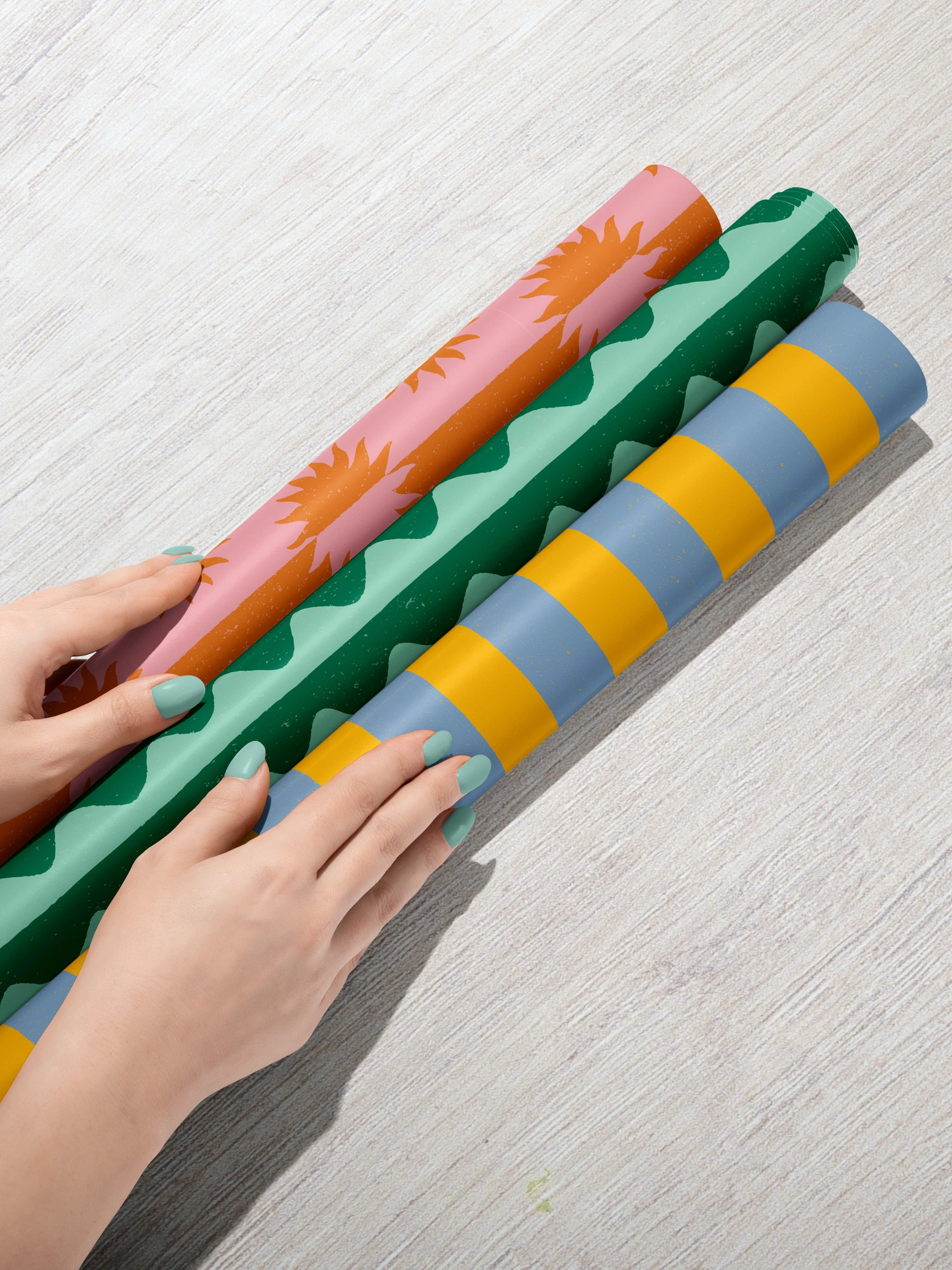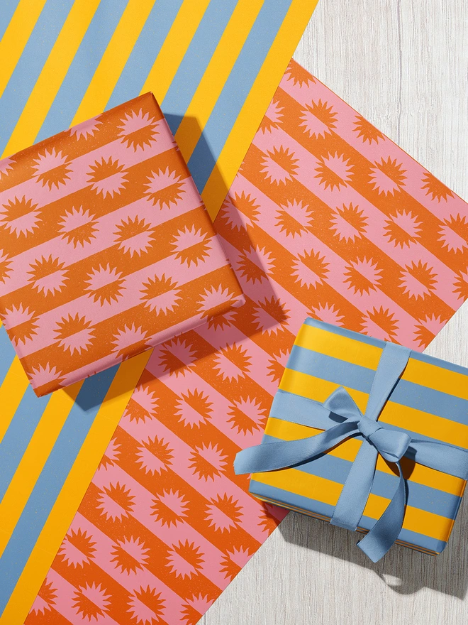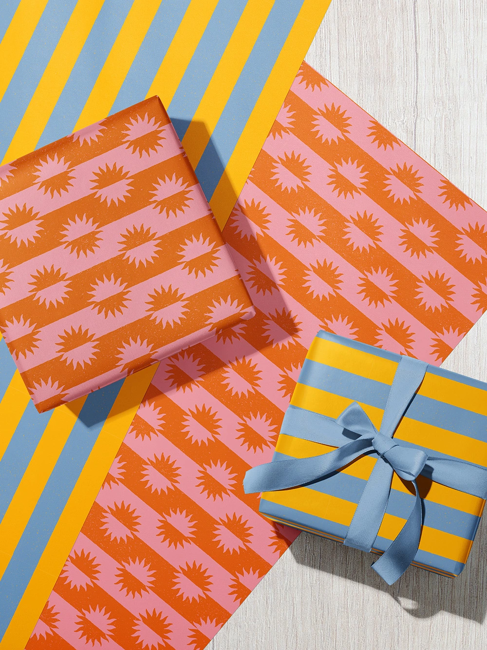 A modern stripy wrapping paper perfect for a variety of occasions including Birthdays, New Babies and Christmas.