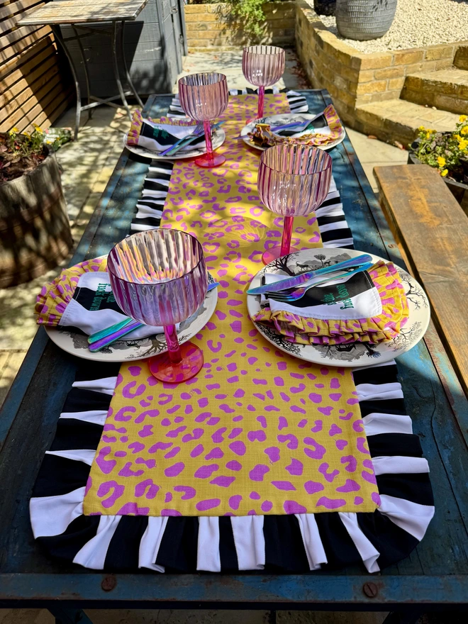 Take a walk on the wild side! For all you animal loving colourful maximalists! This table runner is for you. Pink and yellow leopard print surrounded by a zebra ruffle!