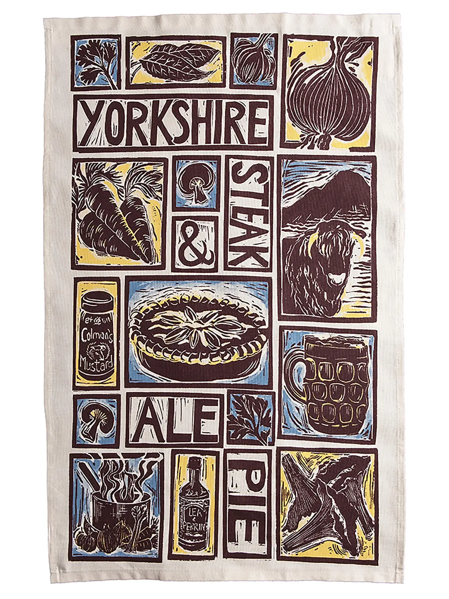 High quality unbleached organic cotton tea towel, screen printed with my unique system of linocut illustrated recipes - each image is an ingredient, the complete design is the recipe - the cookign instructions come on the packaging - everything you need to make a classic Steak and Ale Pie.