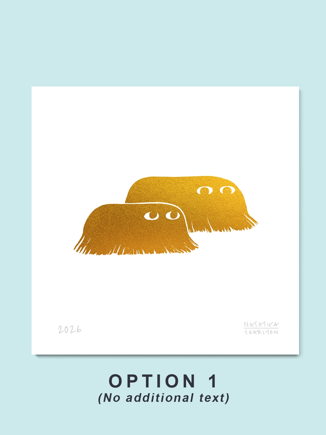 The perfect gift for a loved one (or partner in crime!), why not surprise your Valentine with a unique gift, or celebrate your best friend on her birthday? Perhaps you recognise these little creatures as some mischievous siblings or your favourite Aunty and Uncle? This compact artwork makes for a great wedding gift or anniversary present for a golden couple, with free optional customisation included (well done you – how thoughtful!). Or best of all, treat *yourself* with this sparkly little addition for your home that’s the perfect size to fit into any gap.