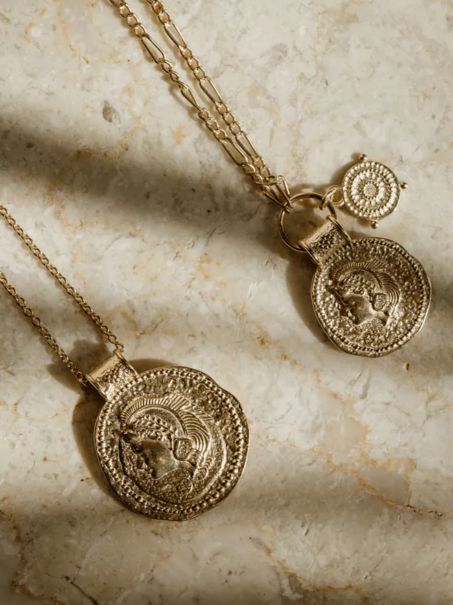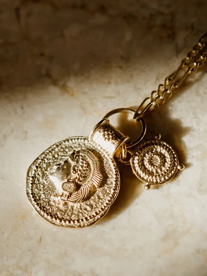 Hanging from the central hoop, is Athena's shield; an extra talisman for protection.
