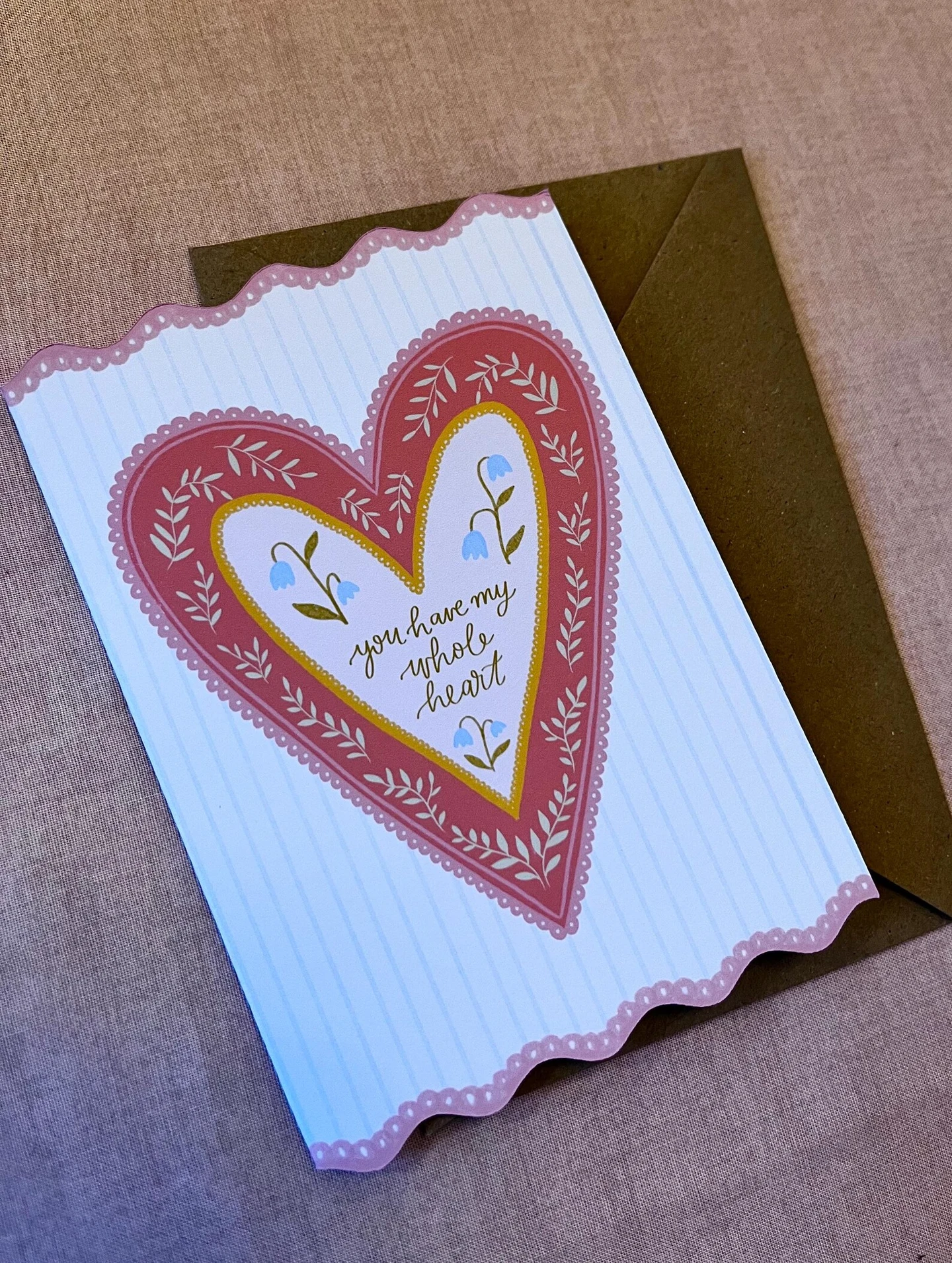 A whimsical Valentine’s Day card with soft florals, leafy botanicals, and a playful wavy edge, featuring the phrase “you have my whole heart.” Romantic, sweet, and a little bit magical—perfect for Valentine’s, anniversaries, or just to remind someone how loved they are.