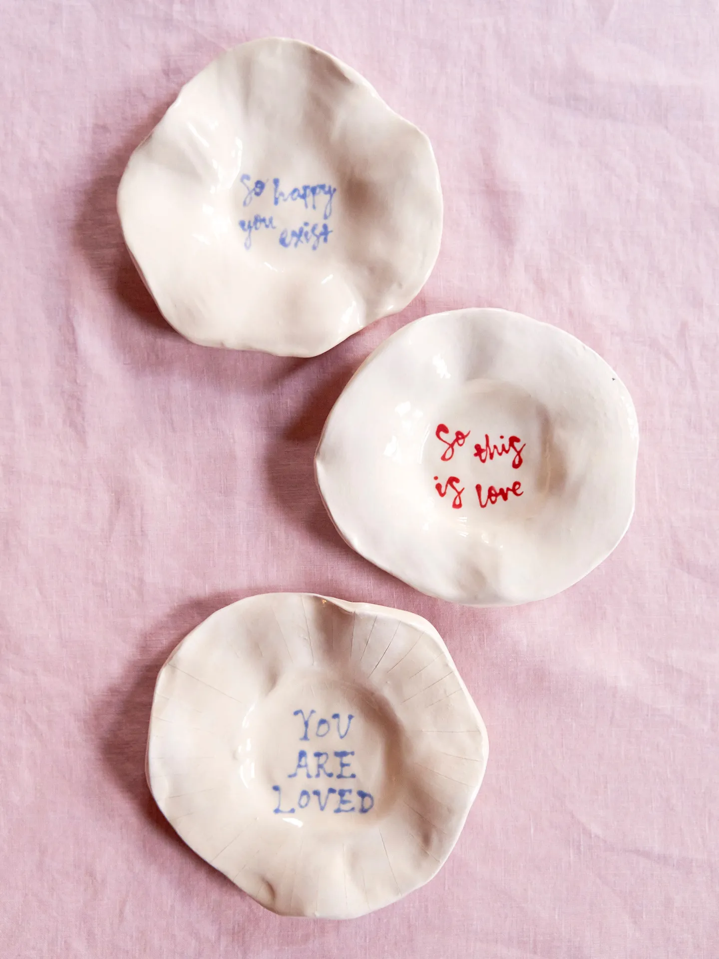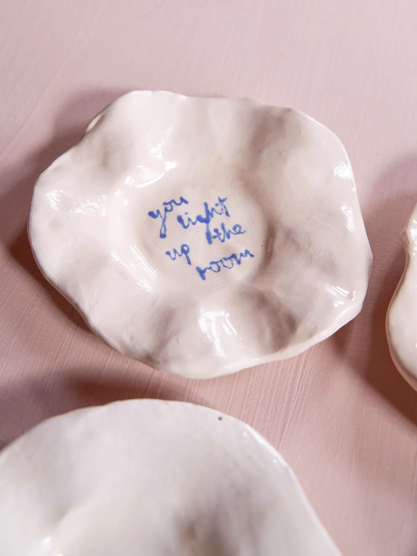Hand drawn inky text on a handmade earthenware mini ceramic plate – created to be a decorative piece for the home