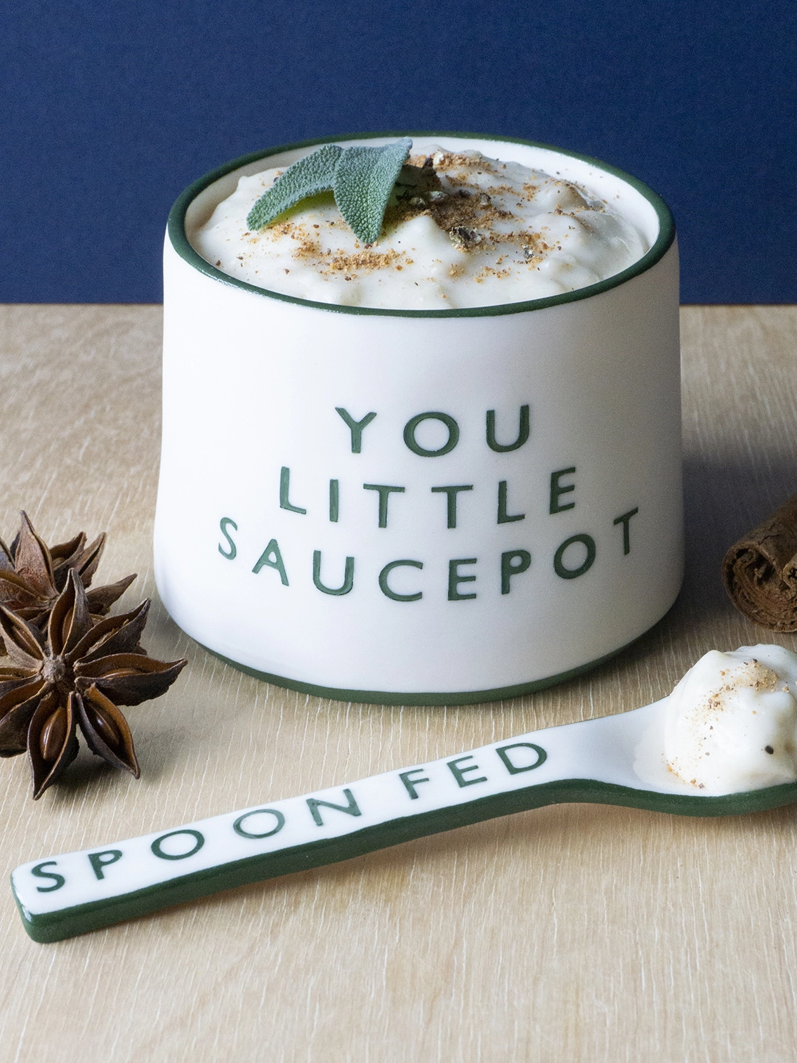 Polished porcelain with green inlaid lettering, food safe underglaze and gloss glazed rim and interior. Spoon not included.