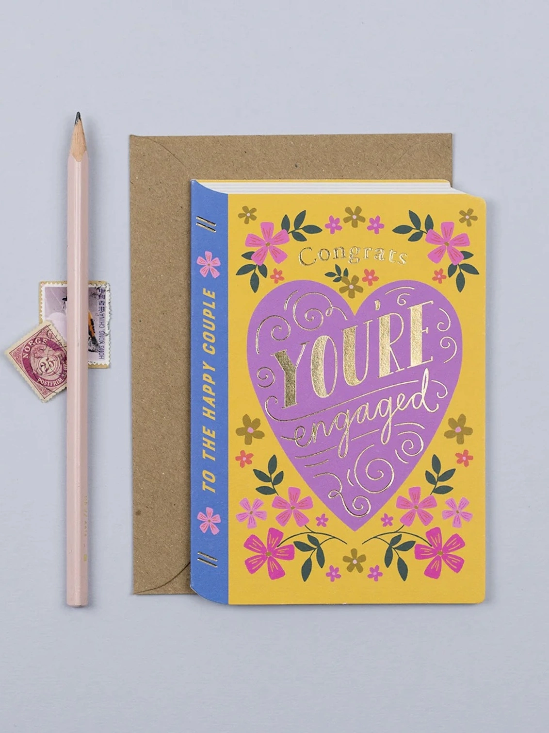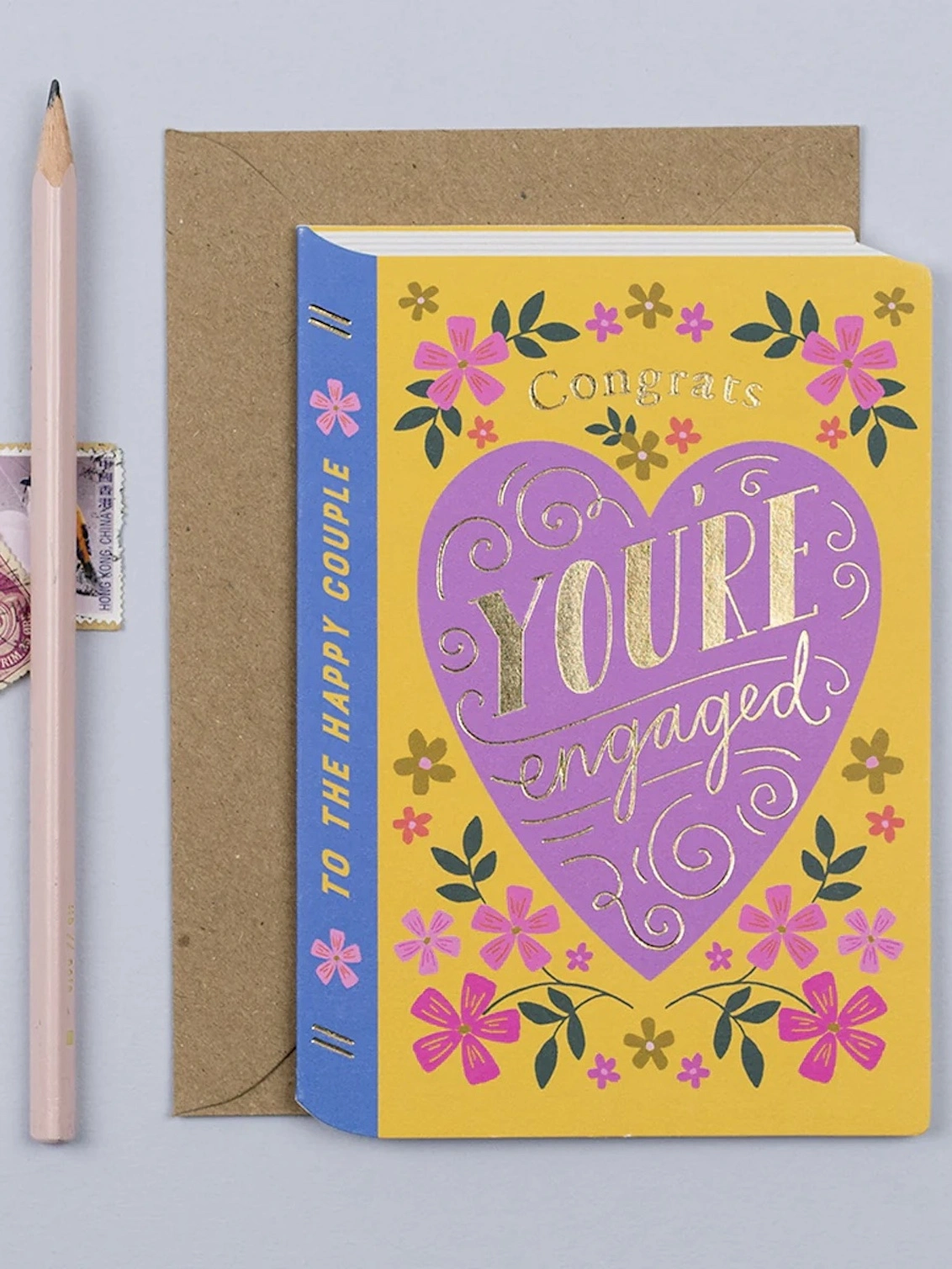 This tale of love is all about the happy couple in your life who’ve just gotten engaged! The storybook-shaped engagement card has colourful floral features and a big purple love heart with a gold foil caption reading “Congrats, You’re Engaged” in hand drawn typography. Add your own message of love to the blank inside of the luxury engagement card for that personal touch.