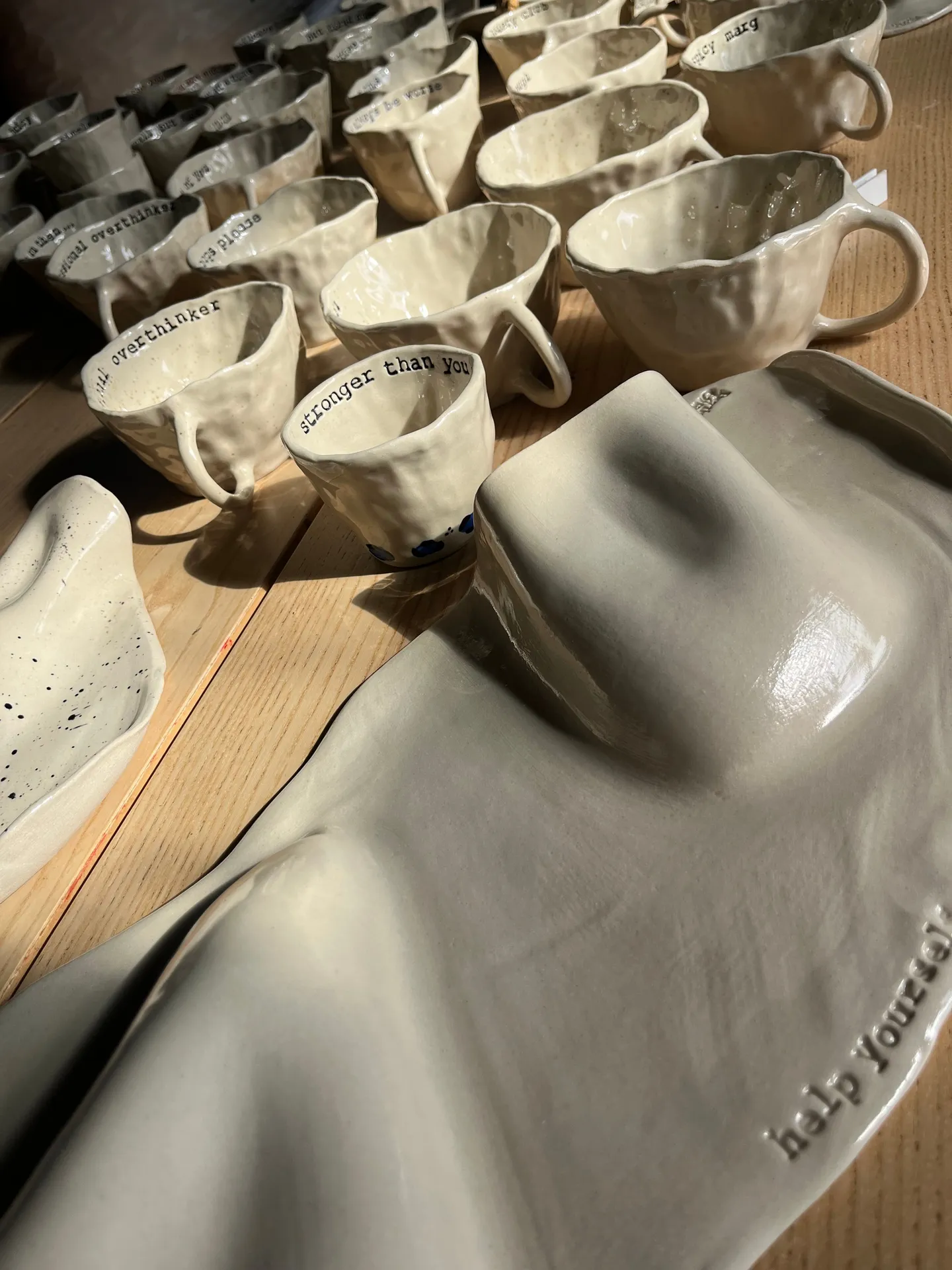 Self taught in my little home studio, I make fun hand-pinched, hand-painted ceramics. Everything from mugs and cups with quotes to make you smile, to functional yet quirky grazing boards. Each piece has its own unique charm and is made slowly with love from me to you.
