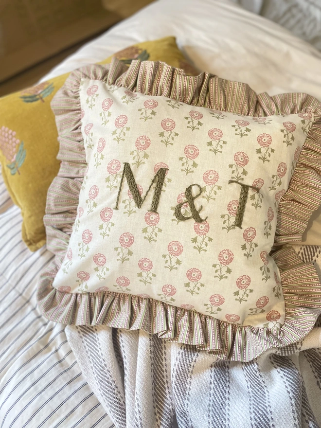Monogrammed Block Print Cushion - Hand Embroidered Initials