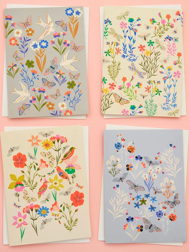 My designs, inspired by vintage patterns and the natural world, begin as delicate pencil sketches that blossom into vibrant, full colour pretty designs. I am committed to sustainability, using biodegradable cellophane wraps for all my cards to ensure my products are as kind to the environment as they are beautiful.