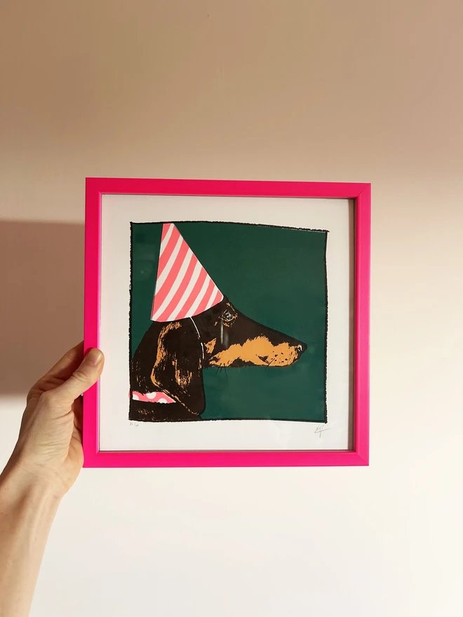 Hannah Carvell is a Screen Printer, printing from her home studio in Somerset. Always bright colours that inject happiness into the art that she makes, whether that be with overlapping shades and shapes in abstract pieces or printing strange made up creatures, colourful hearts and flowers or pink gorillas. Hannah will always come back to a Dachshund in her sketches and they feature heavily in her prints. "I can’t resist them, my earliest memory is being in a pram with a litter of sausages, I have grown up with them, I had my own when I left home for Art college and currently Minnie Moomin is my printing assistant with a bed under my desk." I hope my art will always add a pop of colour to brighten up the walls of your home and spark joy when you walk into a room.