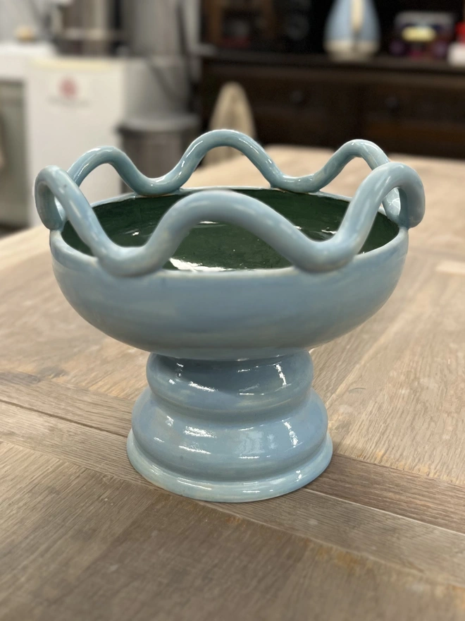 Hannah Inskip creates colourful, chubby ceramics designed to bring a bit of joy to everyday life. Each piece is handmade in small batches using white stoneware clay. Some are thrown on the wheel into wavy-shaped tableware, whilst others use layered coloured slips with wax-resist patterns to create texture through glaze. Hannah’s work blends functionality and ergonomic design with bold colours, textures and fun prints.