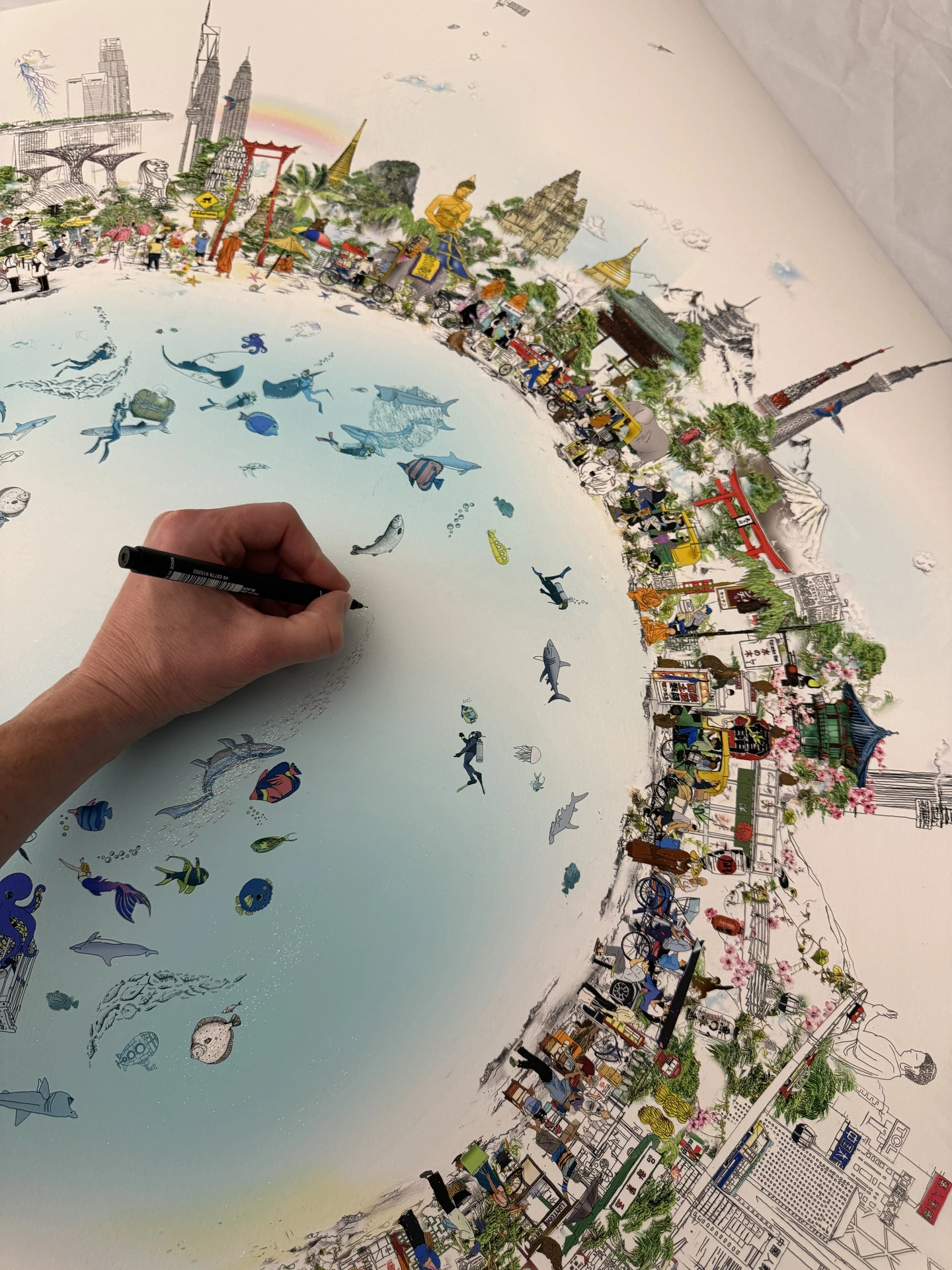 Her pieces often incorporate insightful social commentary, typically related to city-specific events and policies. The artist methodically constructs each cityscape, drawing small sections at a time, and combining them to form the overall scene.
