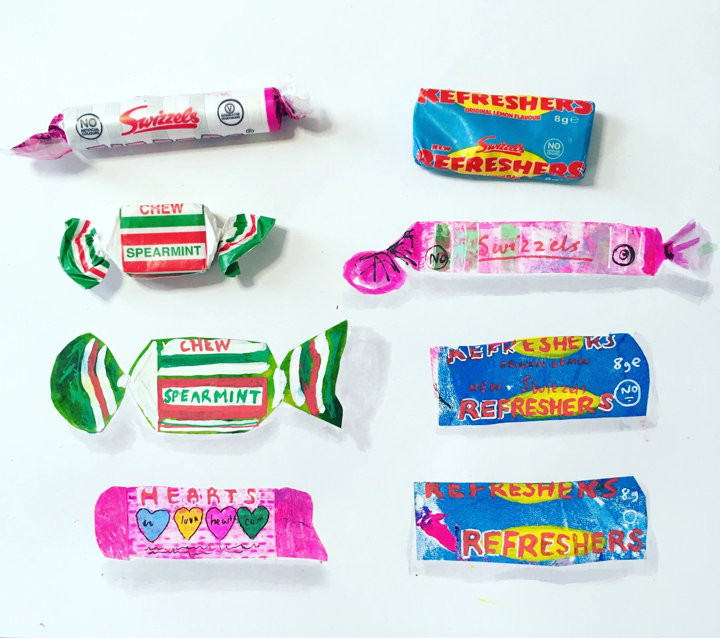 Every piece is made entirely by hand — beginning with printed collage, then layered with hand-drawn illustration. I draw from observation where possible, often working directly from everyday objects.